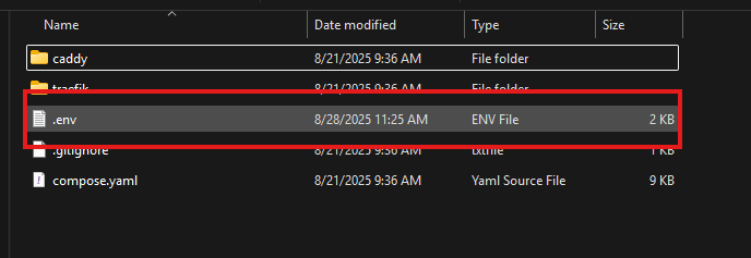 3. Una vez descargado el archivo, extrae la carpeta que contiene el archivo comprimido y abre el archivo llamado .env. Este archivo contiene las diferentes configuraciones que puedes realizar para tu instalación. La configuración minima es la dirección IP o nombre de dominio de tu servidor. Puedes abrir el archivo con cualquier editor de texto como el bloc de notas de Windows.