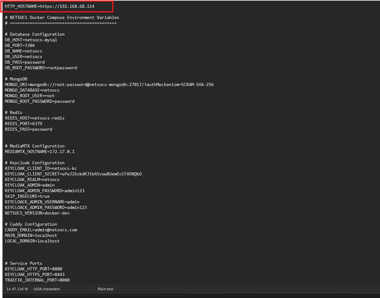 4. En la primera linea del archivo .env puedes configurar el nombre de dominio de tu servidor en la variable HTTP_HOSTNAME. El valor por defecto es https://192.168.1.100. Asegurate de mantener el https:// al inicio.