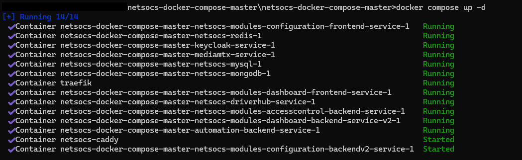 6. En la terminal que se acaba de abrir, ejecuta el comando docker compose up -d y presiona Enter. Esto iniciará los contenedores de Netsocs en segundo plano.