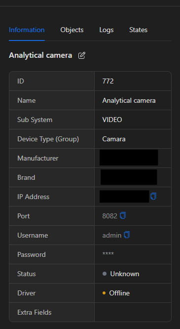 - Extra Fields: Los campos adicionales del dispositivo. Esto son campos que se utilizan para almacenar información adicional del dispositivo, normalmente parametros de configuración que se requieren para la integración.