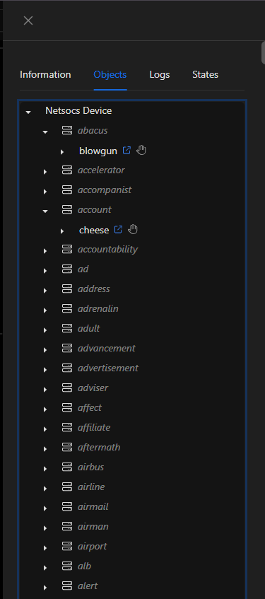 - Objetos: Los objetos son los bloques de construcción de Netsocs Synergy. El icono puede variar en funcion del tipo de objeto.