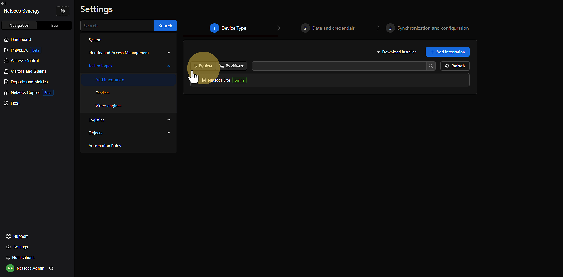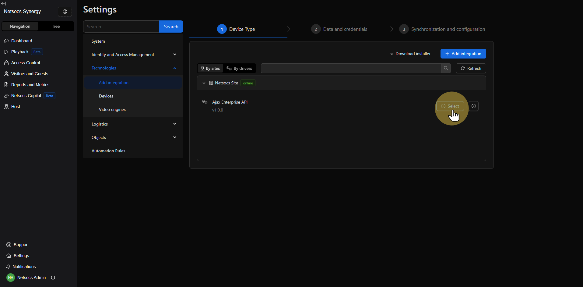 En la interfaz de agregar integración, encontrarás la sección "By Sites". Esta área muestra todos los sitios asociados a Netsocs actualmente y los drivers disponibles en cada uno. Los sitios se instalan estratégicamente para conectar los drivers junto a los dispositivos y así tener acceso a dispositivos en redes cerradas o ubicaciones físicas distintas.