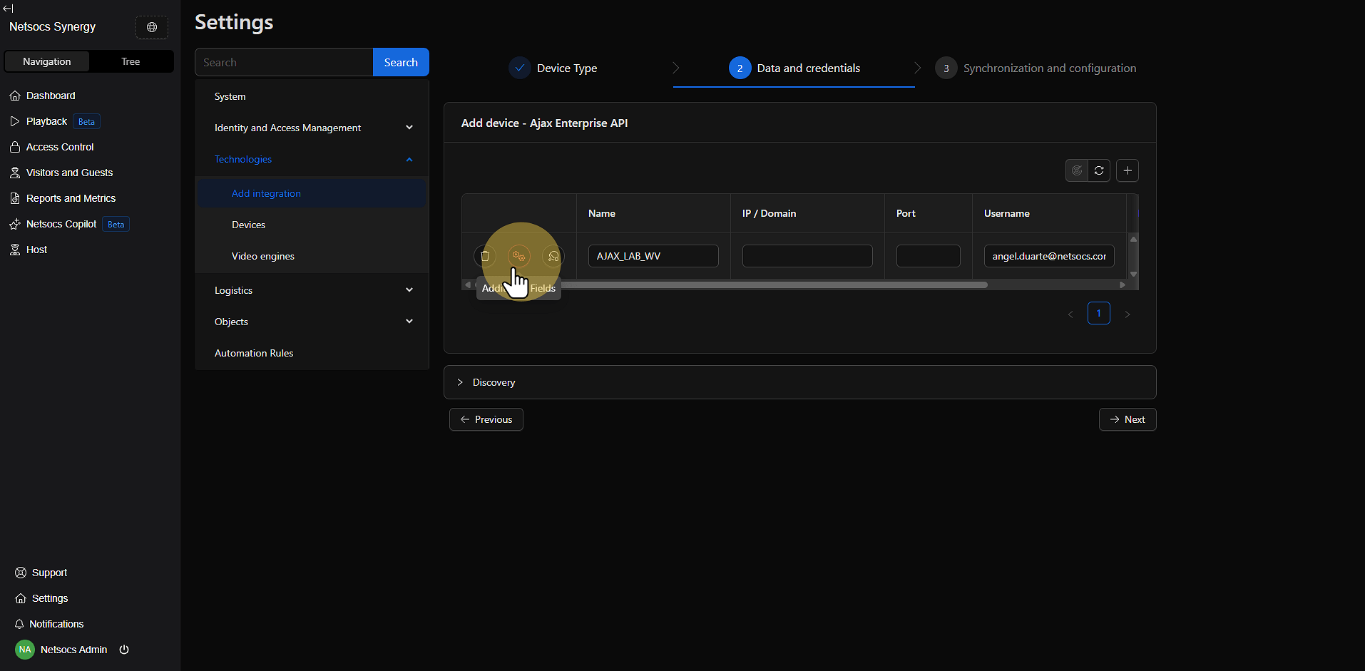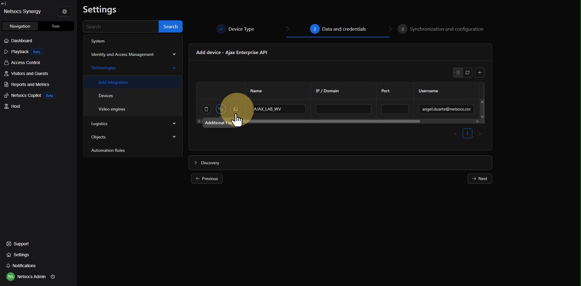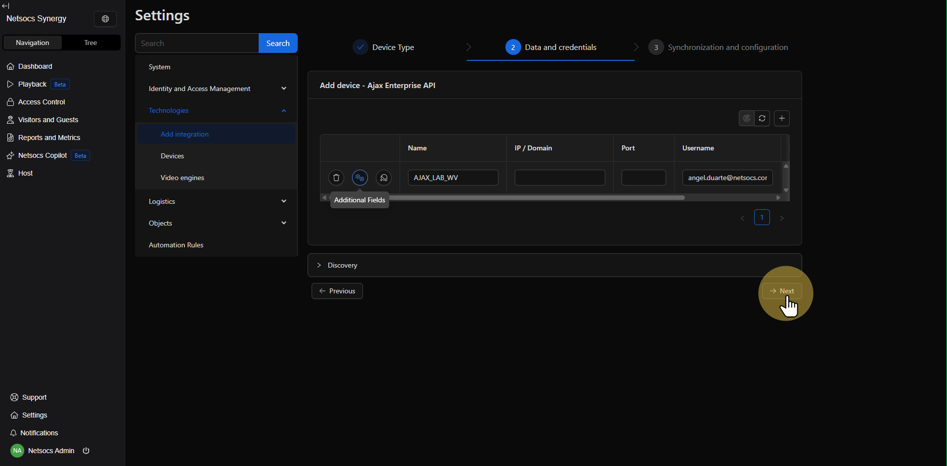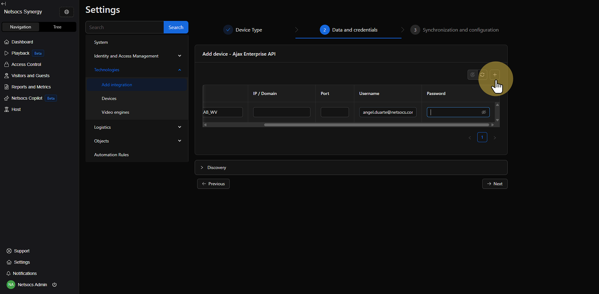 Dentro de la sección de tecnologías, localiza la opción Agregar integración. Esta función te permitirá expandir las capacidades de tu sistema Netsocs incorporando nuevos dispositivos y protocolos de comunicación.